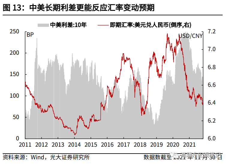 首先,面对疫情冲击,我国将政策利率下调了30BP,而美国则直接将政策利率下调了150BP,从而将中美利差直接推升到了2011年以来的最高水平,进而从资本流动链条推动了人民币汇率升值。另外,原则上,短期利差的变动应该能更好地反映汇率变动预期,它们的期限应更准确地与汇率周期相匹配。但实际上,只要短期利率仍受到货币当局的控制,它们就不能准确预测汇率的变动。因而,实践中汇率变动预期主要是通过长期利率反映的。