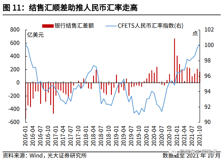 疫情以来,助推人民币汇率强劲上行的力量主要来源于三个方面,一是,疫情对美国和欧洲的不均衡冲击推动美元指数趋势性下行;二是,我国持续强劲的出口增速推动了贸易顺差的扩张,进而带动银行结售汇差额走阔;三是,疫情影响下,美国货币宽松程度强于国内,导致中美利差走阔至历史高位以及美元流动性过于充裕。