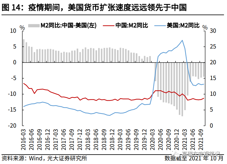 其次,疫情期间,美国M2同比增速最高达到27.0%,国内M2同比增速最高仅为11.1%,期间中美M2同比增速差(中国M2同比增速-美国M2同比增速)一度触及-16.9%,也就是说,美国货币供应量增速明显快于国内,货币供应量的大幅上行,也在一定程度上造成了全球美元流动性过于充裕,进而造成美元兑人民币贬值。