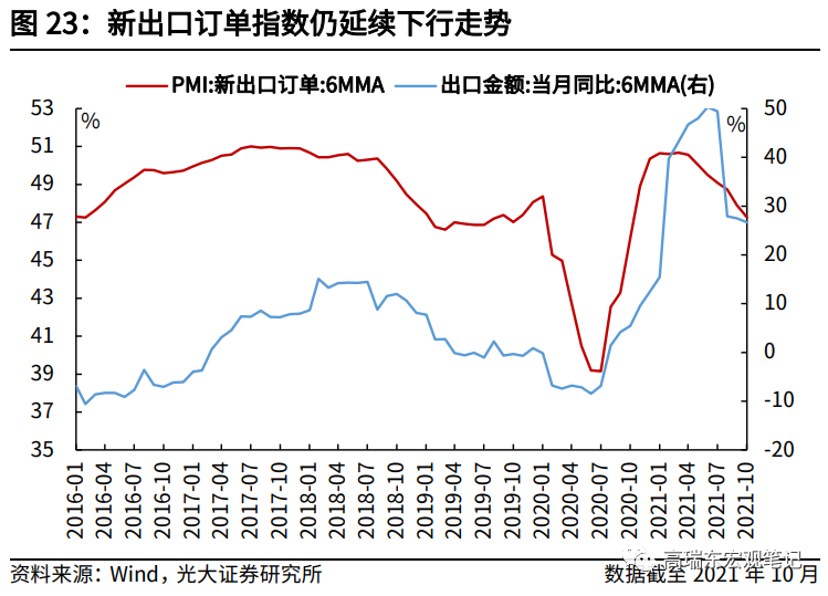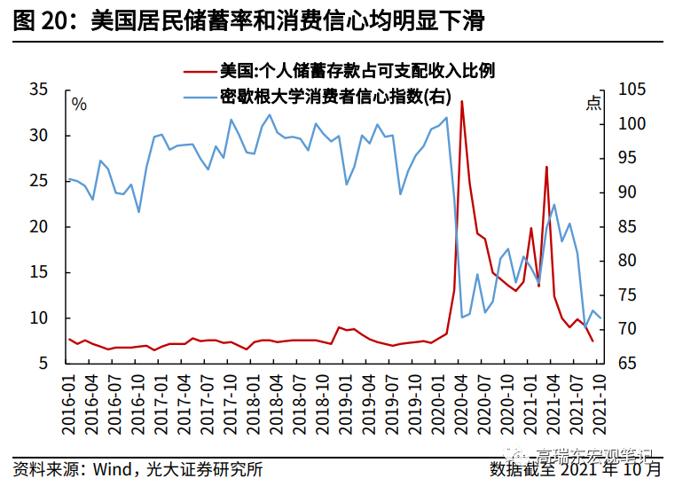 一方面,欧美财政刺激补贴退潮,居民逐步消耗储蓄,财政刺激对于需求的支撑在走弱,出口增速的下行方向已经确定。疫情以来,欧美财政刺激政策通过向居民发放直接补贴和大流行失业补贴,扩充居民的资产负债表,支撑居民消费能力。随着美国失业补贴于9月6日全面到期,居民持续消耗储蓄,财政刺激补贴对于美国居民消费的支撑持续下滑。