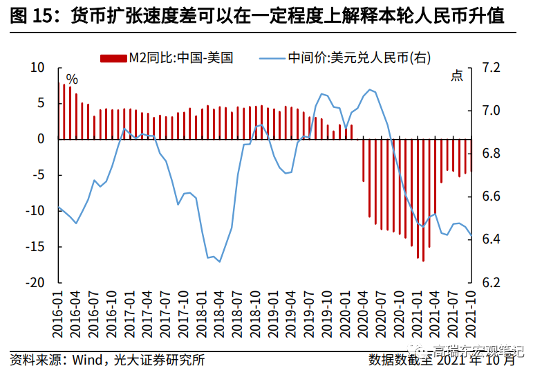 三则,中美货币宽松程度将会趋于收敛,进而带动人民币兑美元回落。向前看,随着Taper落地,美国货币环境正从强宽松转向弱宽松,而后续伴随着加息预期的逐渐发酵,美元流动性将会趋于收紧。与此同时,由于疫情扰动错位导致的中美经济周期错位,使得我国在经济复苏领先美国的同时,经济增速的边际走弱也领先于美国,这使得美国货币环境在从强宽松转向弱宽松的过程中,我国货币环境大概率会转向趋松。两者合力,便使得前期处于走阔态势的中美货币扩张速度差转为收缩,也就是说,中美货币宽松程度将会趋于收敛,进而带动人民币兑美元回落。