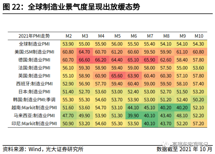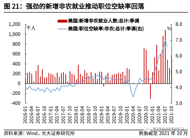 另一方面,疫苗对于重症有较强的抵抗作用,随着疫苗接种持续推进,预计欧美将继续推进复工,疫情反复对于供应链的限制也在减少。10月4日在《柳叶刀》发布美国大型研究结果显示,辉瑞疫苗对于预防重症和死亡的有效性仍然保持在90%左右的高水平,即便是针对具有高度传染性的Delta变种病毒也是如此。但是,虽然疫情影响在减弱,美国国内供应链堵塞的问题目前尚未得到完全解决,并且新冠病毒变异新毒株奥密克戎对经济的影响仍具有较高的不确定性。(详见2021年11月2日发布的《全球再平衡:能源革命、共同富裕、制造重构——2022年宏观年度策略报告》)