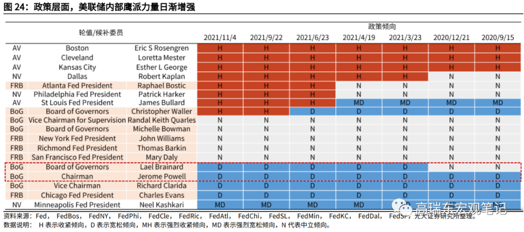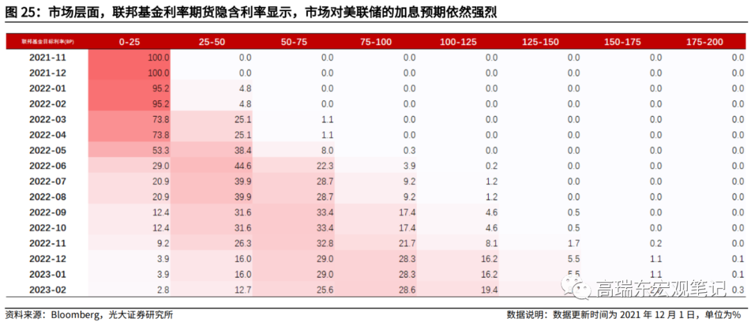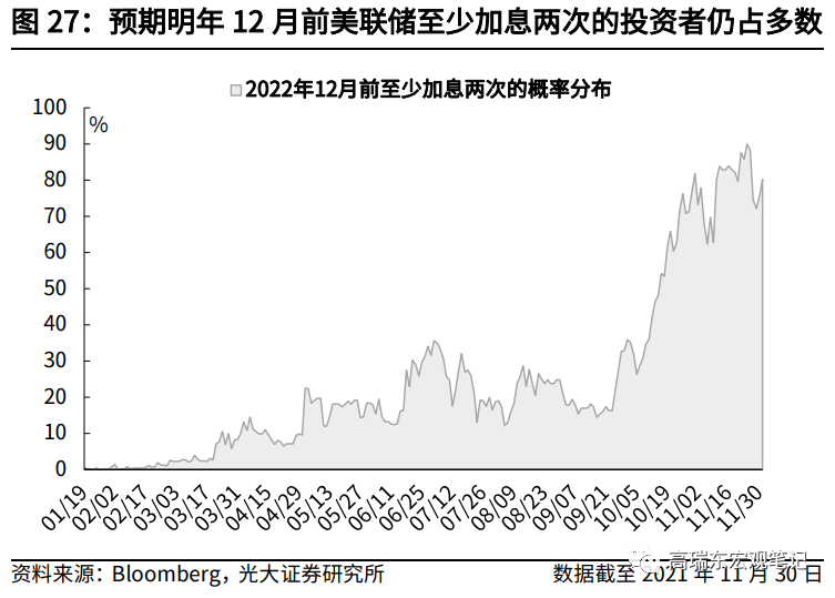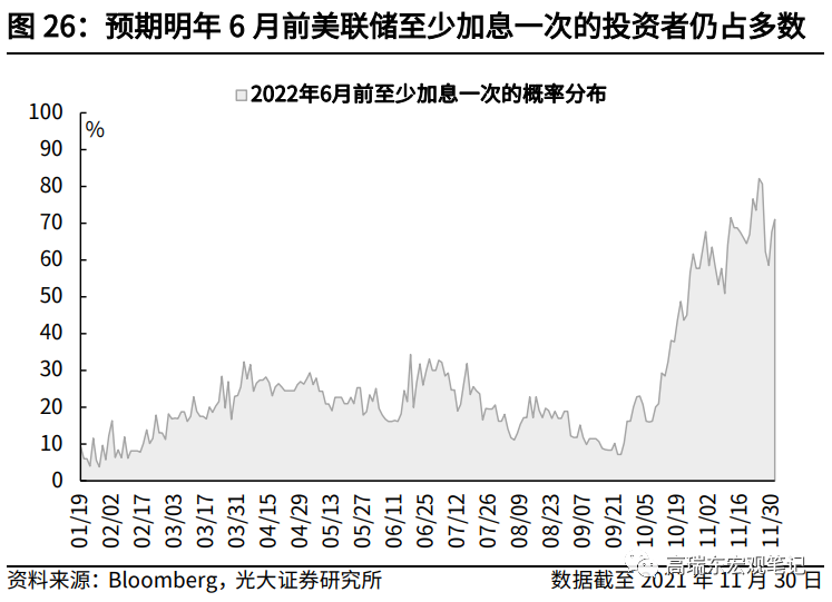美国方面,从政策决策者角度来看,从4月FOMC会议开始,联邦储备系统中的鹰派力量逐渐增强,在18位联储轮值及候补委员中,倾向收紧货币政策的决策者由3月份的3人增加至11月份的8人;在11位FOMC票委中,倾向收紧货币政策的决策者由3月份的0人增加至1月份的2人。从市场参与者角度来看,10月以来,投资者对明年美联储开始加息的预期日渐强烈。根据今年以来美国联邦利率期货走势隐含的加息概率,可以看到,10月1日市场预期2022年6月前,美联储至少加息一次的概率分布仅为16%左右,而到了11月30日,这一概率已经攀升至71%。目前来看,美联储大概率会加快Taper进程。