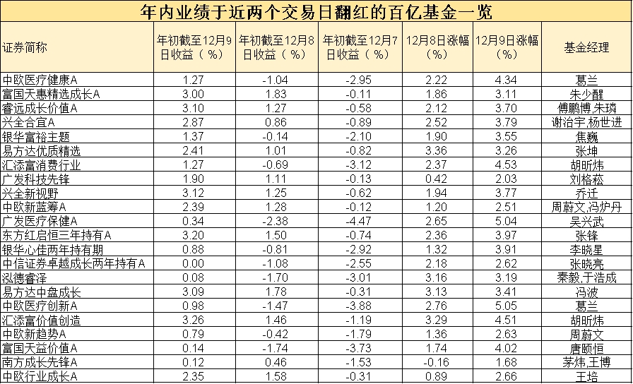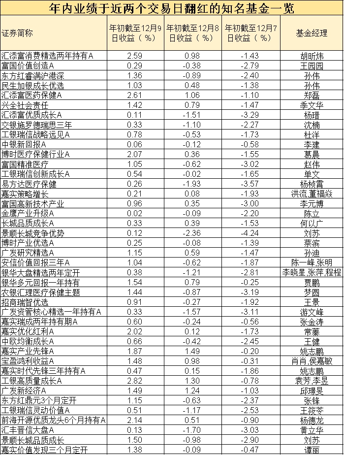 “医药女神”葛兰是其中之一。其代表产品中欧医疗健康截至12月7日年内跌幅2.75%,8日上涨2.22%后跌幅收窄至1%左右。此后经历12月9日4%以上的单日涨幅,该基金收复此前失地,年内收益率翻红至1.27%。