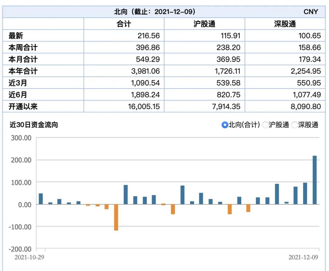 另一方面,12月8日北上资金大手笔抄底白酒,而12月9日市场更加沸腾。Wind统计显示,12月9日,北向资金大幅净买入216.56亿元。五粮液、用友网络、贵州茅台分别获净买入11.8亿元、10.27亿元、9.64亿元。
