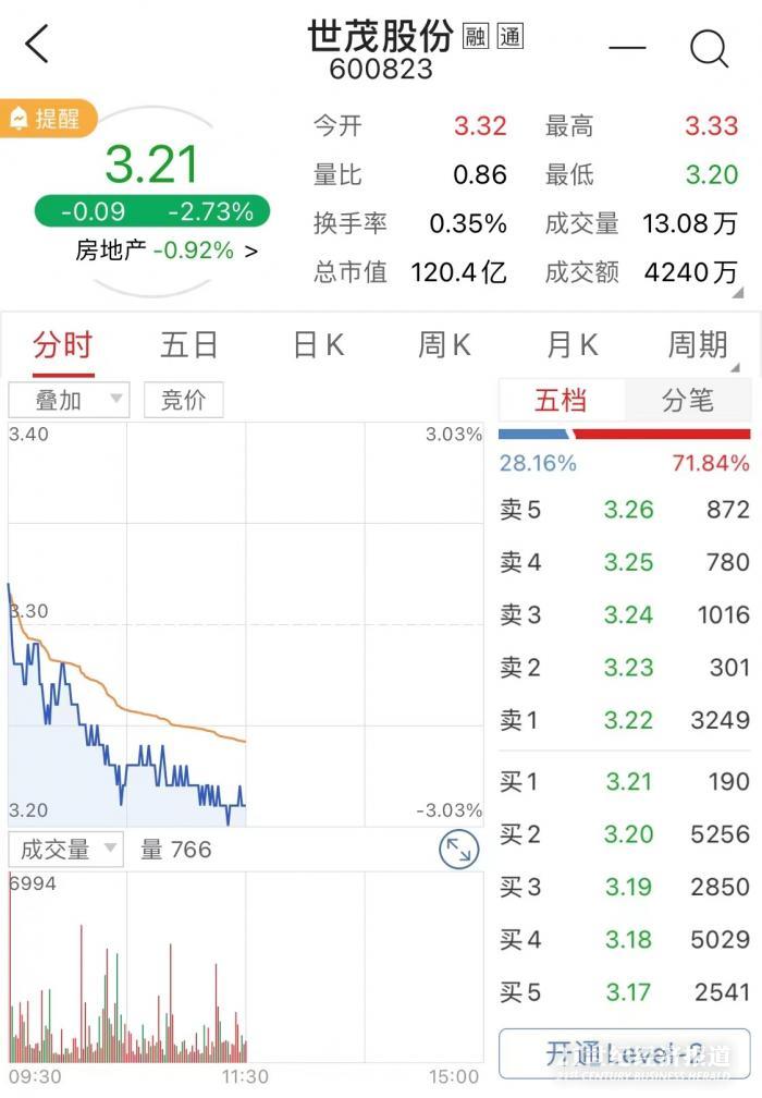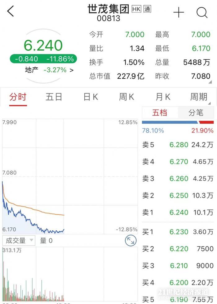 世茂服务母公司世茂集团(00813.HK,简称“世茂”)则延续前一天跌幅,午盘收市价6.24元人民币,跌幅11.86%,总市值227.9亿。世茂系内上市公司均受波及,世茂股份(600823.SH)午盘收报3.21元人民币,跌幅2.73%。
