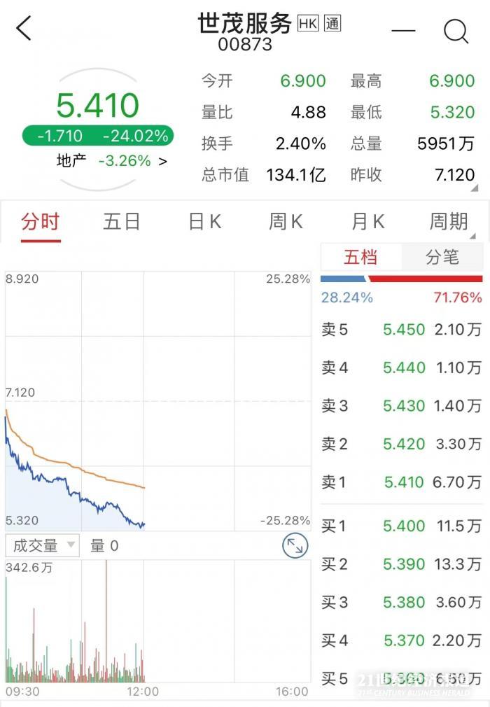 21世纪经济报道 唐韶葵 上海报道 12月14日港股午盘收市,世茂服务(00873.HK)跌幅扩大,收报5.410港元,跌幅24.02%,创上市新低。截至记者发稿时止,世茂服务总成交3.52亿港元,总市值134.1亿港元。