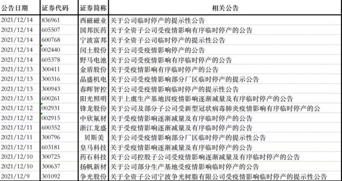 受疫情影响,过去一周以来,多家浙江上市公司发布临时停产公告。21世纪经济报道记者统计,截至12月14日19时,因疫情公告停产事项的上市公司已经达17家,多家企业公告表示,预判本次停产是防疫工作的短期措施,不会对公司的长期发展带来不利影响。