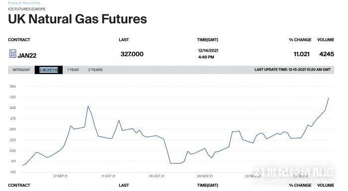 12月14日,TTF基准荷兰天然气期货飙升突破130欧元/兆瓦时,高于今年10月初创下的116.5欧元/兆瓦时的历史最高值;ICE英国天然气期货价格飙升至3.24英镑/千卡,刷新了10月5日创下的2.94英镑/千卡的历史高点。