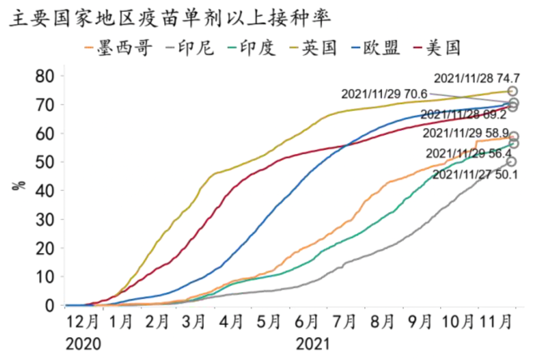 二是全球疫苗失衡有望改善,纾解全球供给瓶颈。随着美欧发达国家的接种率趋于饱和以及疫苗产能快速爬坡,发达与新兴市场国家的接种差将不断缩窄。目前墨西哥、印度、巴西等国接种率均已突破50%。根据国际药品制造商联合会(IFPMA)估算,新冠疫苗产能将在今年底和明年中分别达到120亿剂和240亿剂,辉瑞也宣布将免费授权95个低收入国家仿制特效药,有望覆盖40亿人口,这意味着明年年中发展中国家接种率有望接近发达国家,促进经济活动向疫前回归。