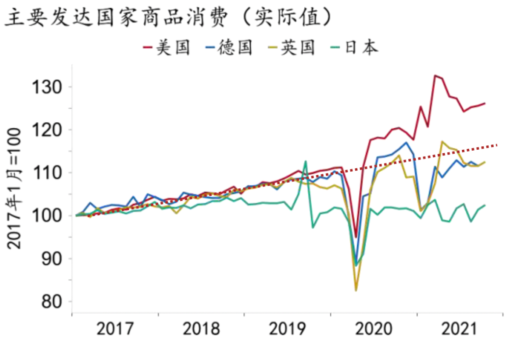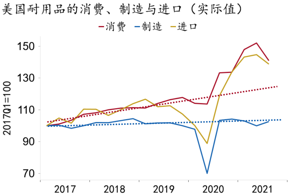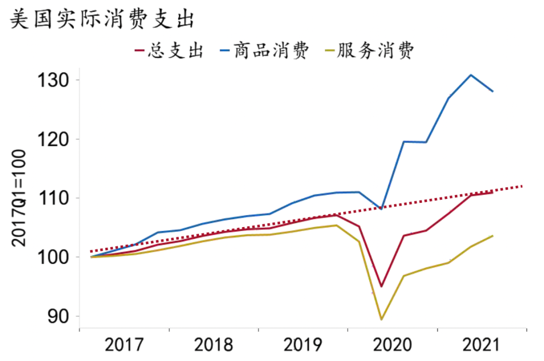 疫情冲击后,宏观刺激和“疫苗复苏”下发达国家商品需求率先恢复,尤以美国商品消费的大幅扩张为甚。从全球看,美国商品消费修复远超其他发达国家,目前美国累计实际商品消费两年平均增速达8.1%(1-10月),英国为1.6%(1-10月),而德国仅为0.8%(1-9月)(图3)。在美国整体消费修复至疫情前趋势水平的情况下,从结构上看,商品消费远超疫情前趋势水平,服务消费则受到显著抑制(图4)。美国“超调”的商品消费扩张主要由进口支撑,今年前三季度其耐用品消费较2019年同期扩张了29.3%,耐用品进口扩张了24.4%,而生产仅增长0.3%(图5)。