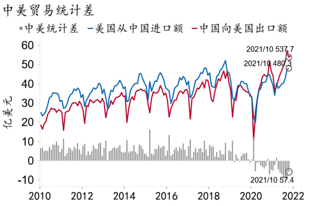 从全球看,疫情和其他原因导致全球产业链的关键环节、以及运输和销售上的关键节点遭遇瓶颈,造成短缺。一是疫情仍对局部地区的生产形成限制,产业链全球化分布下,部分国家生产停滞令整条产业链受阻。这集中表现在全球能源和芯片短缺上。受“缺芯”影响,美国交运制造业产能利用率仍低于疫前水平(图 8)。二是全球供需失衡之下单向运输,导致航运运力不足、集装箱紧张和港口负荷大幅攀升。中美贸易统计差关系逆转,指向大量中国向美出口由于物流受阻并未抵岸(图 9)。三是疫情前上游原材料行业周期性投资不足,叠加全球“脱碳”造成化石能源投资不足,能源供应稳定性下降,加剧了当前能源和原材料供应短缺。