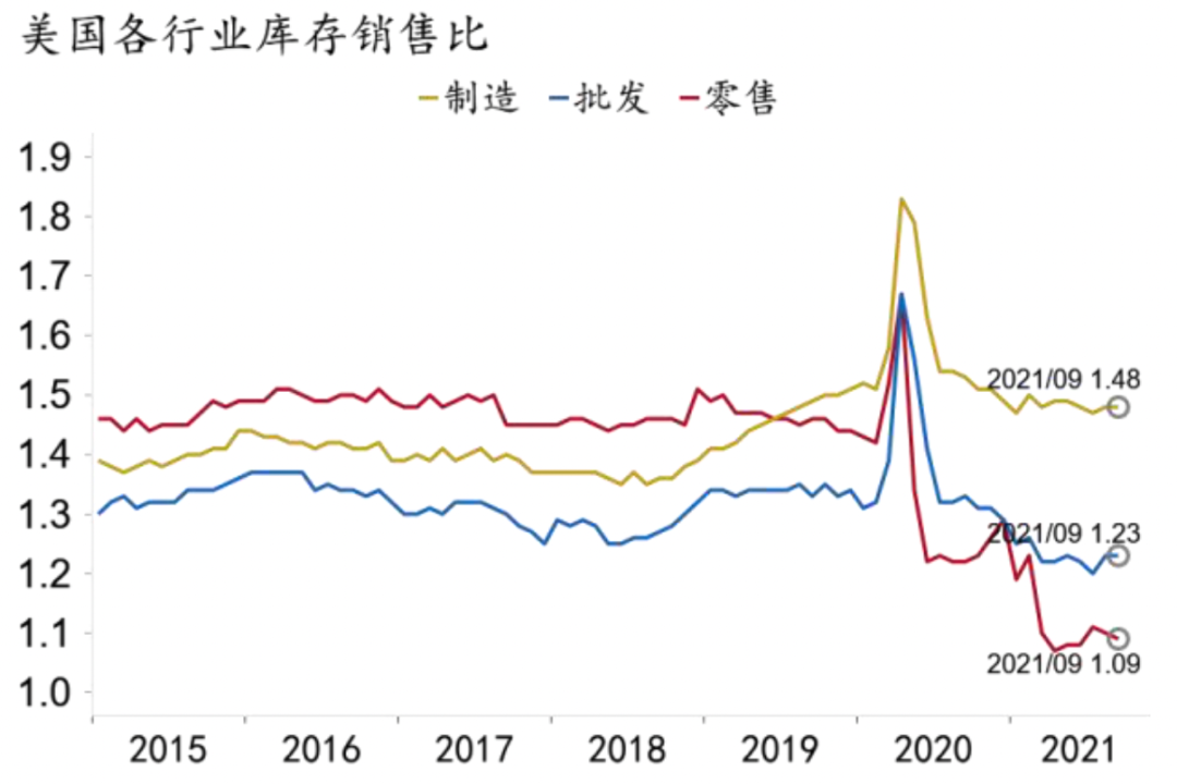 美国内部也面临严重的供给约束。一是劳动力市场面临结构性短缺,非农就业仍显著低于疫前水平。二是美国国内供应链紊乱,物流链条堵塞,加剧了美国国内终端消费品的短缺。库存数据显示,美国制造和批发行业库存已超出疫前或接近疫前趋势水平,但零售库存却在圣诞季来临之际跌落至历史低位(图10)。