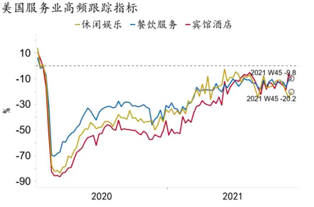 明年美国需求侧仍将维持旺盛,但重心转向服务业,外溢的需求总体收缩。一方面,虽然美国超宽松宏观刺激效应逐渐衰减,但美国居民名义收入和可支配财富明显高于疫前,明年仍有望对居民消费提供支撑(图6)。美国边境在11月如期开放,将提振美国服务消费外需。此外,明年美国政府支出将受到拜登基建法案和社保法案的支撑。总额约1.1万亿美元的基建法案已经签署生效,将在未来5年带来约5,500亿美元的额外开支;另外,为期10年近2万亿美元的社保环保法案已经通过众议院,可能于今年年内落地。考虑到约1.2的财政乘数,两者明年有望贡献3,700亿美元以上的总需求。但另一方面,明年随着居民经济活动进一步回归常态,服务消费将成为居民消费的主要增长点,尤其是接触性服务业有望加速修复(图7),而超额的商品消费特别是耐用品消费难以持续,增速将出现下滑。明年美国外溢的商品需求也将因此收缩。