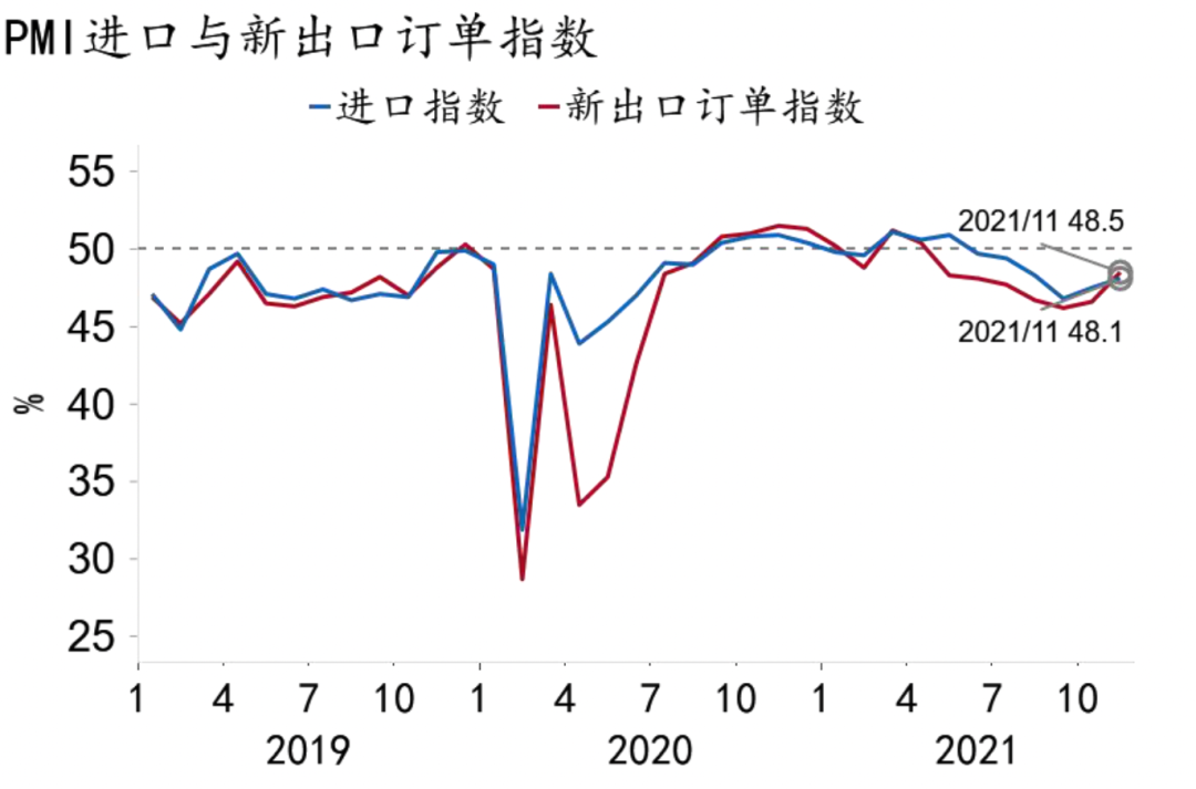 需求方面,明年外需和房地产投资增速回落将更加明显,消费大概率仍将处于弱复苏状态,制造业投资动能边际衰减,基建投资有望发挥托底作用。具体来看,一是进出口景气度料将下滑。明年美欧“疫苗复苏”下供需缺口收窄,经济修复重心转向服务业,将使得我国出口增长承压。一二季度出口价格仍将对出口金额形成拉动,而出口数量增速逐渐放缓;进口金额增速将与出口同步回落,进口价格增速高位缓慢回落,量上继续收缩。出口景气度的回落将对我国出口产业链造成负面影响,部分消费品和机电设备行业可能将面临产量下滑、利润收缩的局面,进而拖累制造业相关领域投资,特别是考虑到今年以来我国贸易条件显著恶化,新出口订单持续萎缩(图11),对外贸企业利润造成了严重挤压。