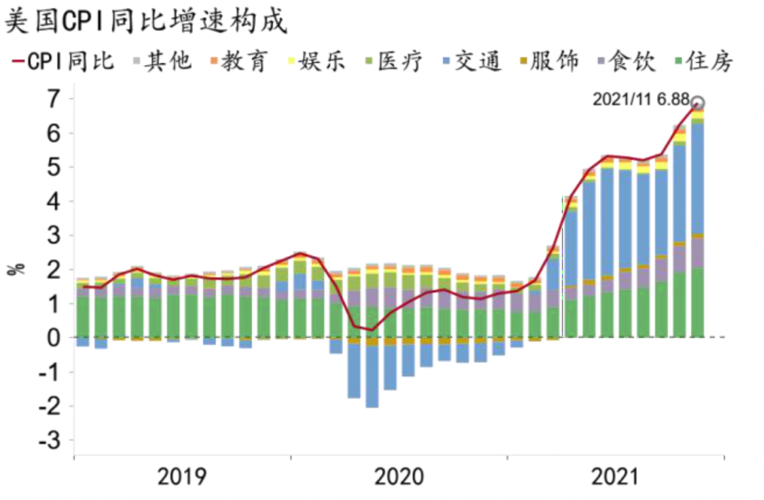 今年二季度以来,在供需缺口和基数效应的作用下,美国通胀快速上行。3月突破2%大关后,5月以来一直稳定在5%上方,11月更是创下6.9%的39年新高(图15)。
