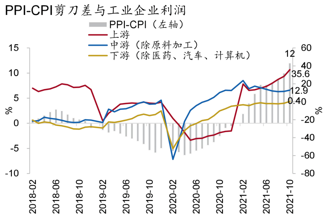 供给方面,明年需求疲弱将拖累工业生产,服务业以及中小微企业经营仍面临困难,但政策约束有望边际放松。明年因出口回落叠加内需疲弱,需求对于供给的牵引作用将进一步减弱,工业生产增速将低于历史中枢。随着PPI-CPI剪刀差收敛,上中下游行业利润分化有望缓解,但由于原材料价格短期难以迅速回落,分化缓和的过程或将较为缓慢,中下游企业受消费低迷影响,利润承压(图14)。服务业生产尽管将保持修复,但明年零星疫情仍有可能发生,零容忍的防疫政策或仍将对服务业生产恢复构成约束。好的方面是,供给侧受到的政策约束有望边际放松。一是随着全球产业链内生性修复,生产资料短缺压力减轻,煤炭产量增长,电力供需紧张局面将得到缓解;二是尽管“双碳”“双控”政策仍将继续压缩高耗能高碳排放行业产能,但因经济增长压力较大,以及对政策“一刀切”执行纠偏,对经济的供给冲击预计将有所缓解。