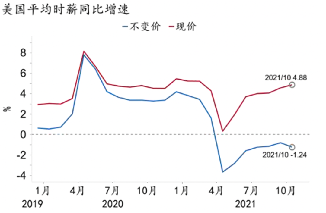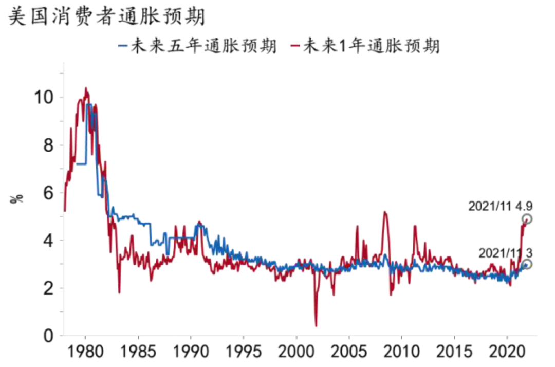 尽管如此,通胀持续超预期的风险仍不可低估。一方面,疫情可能对全球供应链造成持续扰动,近期出现的Omicron毒株可能导致各国再度封锁,并继续拉大发达与发展中国家的疫苗差,甚至加剧供需缺口带来的高通胀。另一方面,美国实际时薪增速为负(图21),随着民众通胀预期上调(图22)和劳动力短缺持续,薪酬面临进一步上涨压力,迫使企业提升价格转移成本,导致“工资-物价”的螺旋式上升。