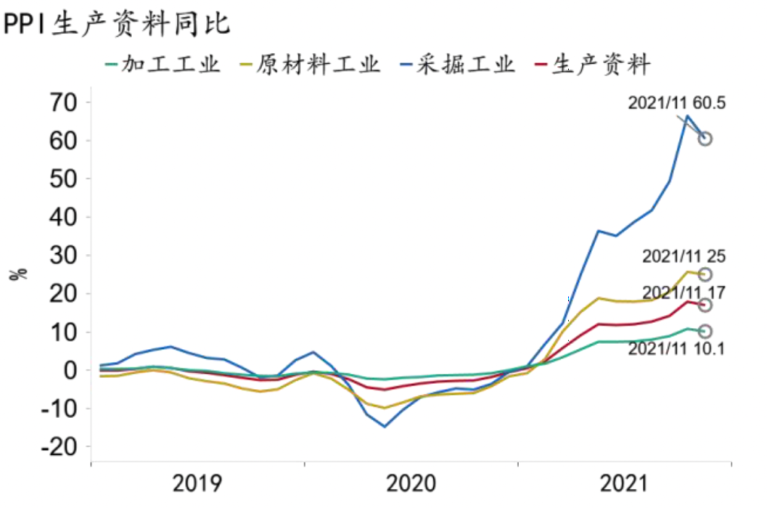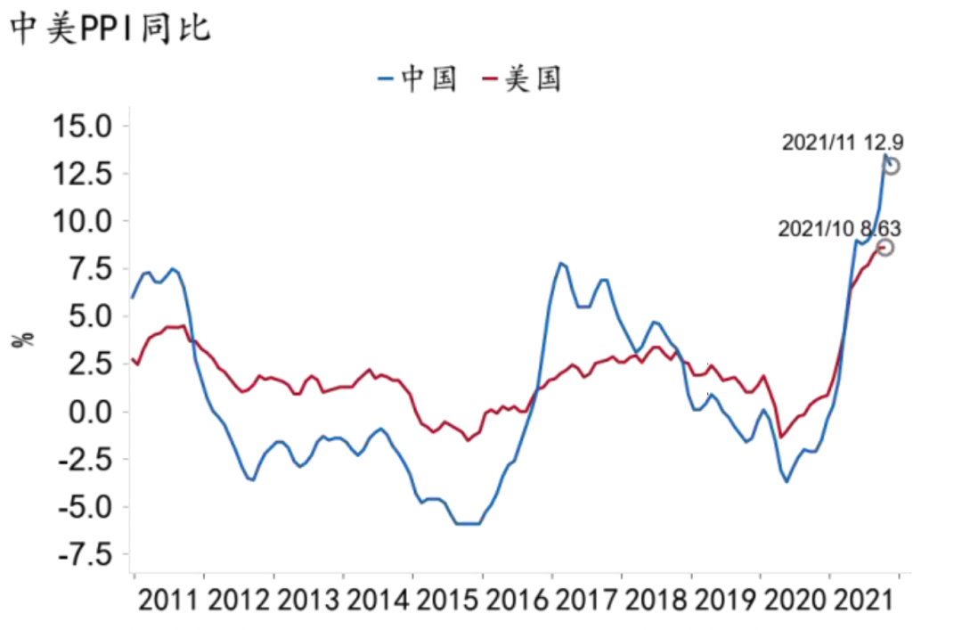 前瞻地看,明年由于国内总需求偏弱,决定PPI走势的因素仍然在供给侧。一是国际大宗商品价格有望自高位缓慢回落,输入性通胀压力得到缓解。2022年,随着全球需求回升速度放缓、供给紧张程度减轻,多数大宗商品的价格有望自今年的高点边际回落,但依旧处于较高水平,大宗商品价格对PPI同比增速的拉动作用将显著降低。不过,仍然存在极端天气、疫情再次爆发、供应链阻塞延长等可能推升大宗商品价格的不确定性。二是保供稳价政策起效,明年原材料生产受到的政策约束有望边际缓解。10月中下旬以来,全国煤炭产量大幅增加,煤炭、钢铁等商品价格开始回落,未来随着各项保供稳价措施落地见效,叠加总需求偏弱,国内原材料供应紧张的局面有望减轻。但“双碳”“双控”作为长期目标,将持续约束煤炭、钢铁、化工等高能耗行业的生产,限制工业品价格下行。三是高基数效应。今年的高基数决定了明年PPI同比增速很难继续维持高位。