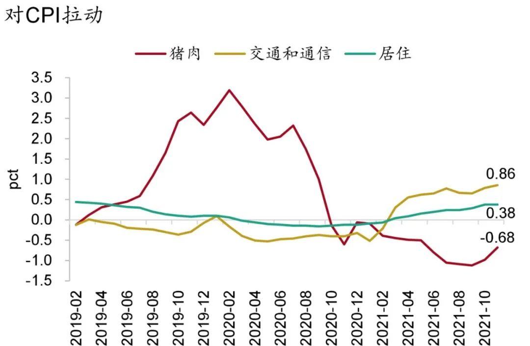CPI方面,今年我国消费品价格表现低迷,1-11月CPI累计同比增速只有0.9%。猪肉价格下跌和消费需求较弱是主要原因。由于猪肉价格自去年末以来快速下行,导致其对CPI同比增速的拖累不断扩大。同时居民消费复苏较弱,难以对CPI形成拉动。而能源价格上涨则是支撑CPI的重要力量。今年石油、天然气等能源价格持续上涨,推升交通工具用燃料与水电燃料价格,表现为居住分项、交通和通信分项对CPI同比增速的拉动显著提升(图27)。核心CPI随经济修复小幅回升,不过受居民消费低迷影响,PPI向CPI的传导幅度有限。