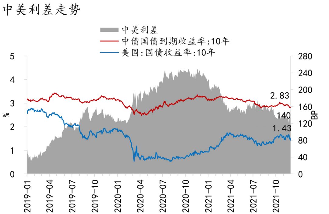 但综合考虑,明年我国货币政策立场仍将倾向“稳增长”。从通胀上看,CPI明年大概率将温和通胀,PPI高通胀明年有望回落。我国的结构性通胀主要由供给冲击导致,而货币政策作为需求管理工具,无法解决供给侧问题。同时,PPI-CPI剪刀差不断扩张挤压中下游企业利润,反而需要货币政策进一步加大对中小企业的定向流动性支持。从外部均衡看,人民币汇率运行总体平稳,10月以来小幅升值,且当前中美利差显著高于80-100bp的“舒适区间”,为美联储货币政策转向的外溢提供了缓冲(图37)。但从趋势上看,美欧货币政策收紧仍将通过影响跨境资本流动和人民币汇率对我国货币政策放松的空间形成一定制约。