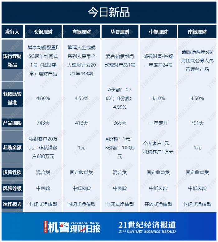 《机警理财日报》是南财理财通、21世纪经济报道旗下投资理财专栏,旨在帮投资者守好“钱袋子”。课题报道组长期关注银行理财,并搭建独有理财数据库,欢迎申请试用。本专栏每日内容各有侧重,周一聚焦固收+产品、周二纯固收产品、周三现金管理类产品、周四混合类产品、周五权益类产品,每周一至周五更新,移动端内容尽在21财经APP,平面内容尽在《21世纪经济报道》报纸【南财理财通】专栏,敬请关注!