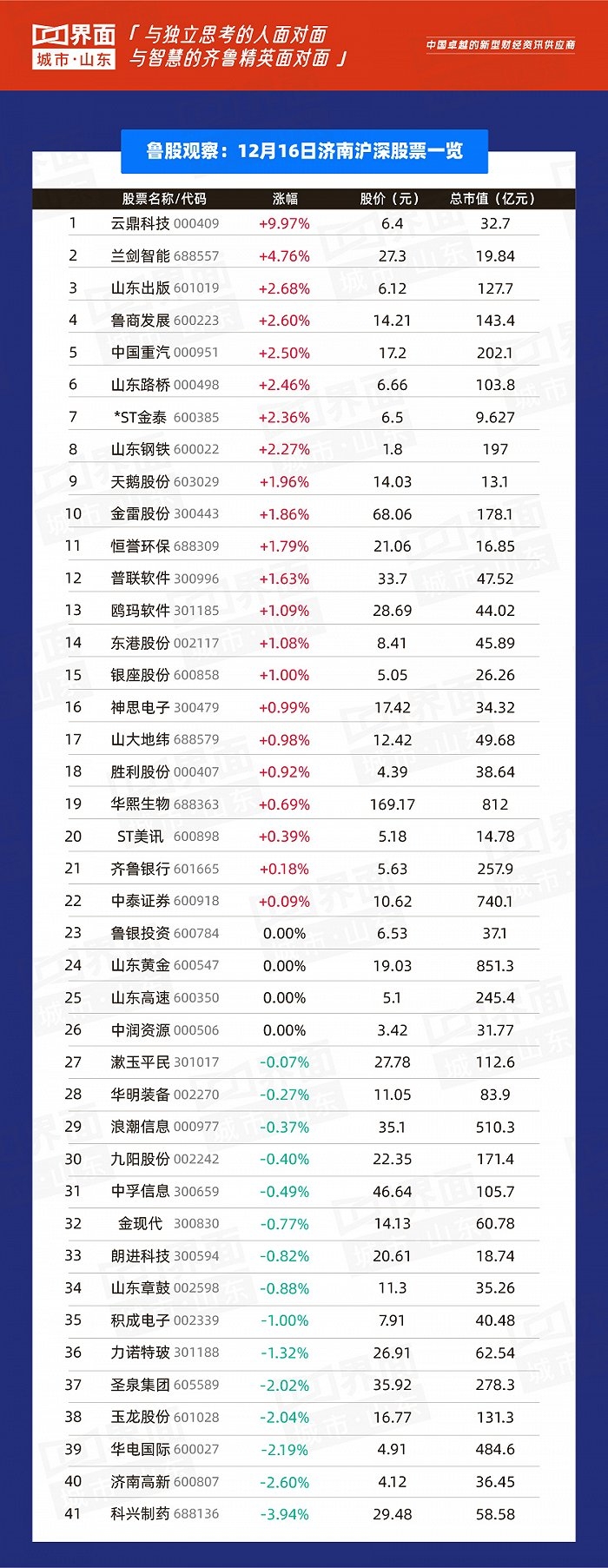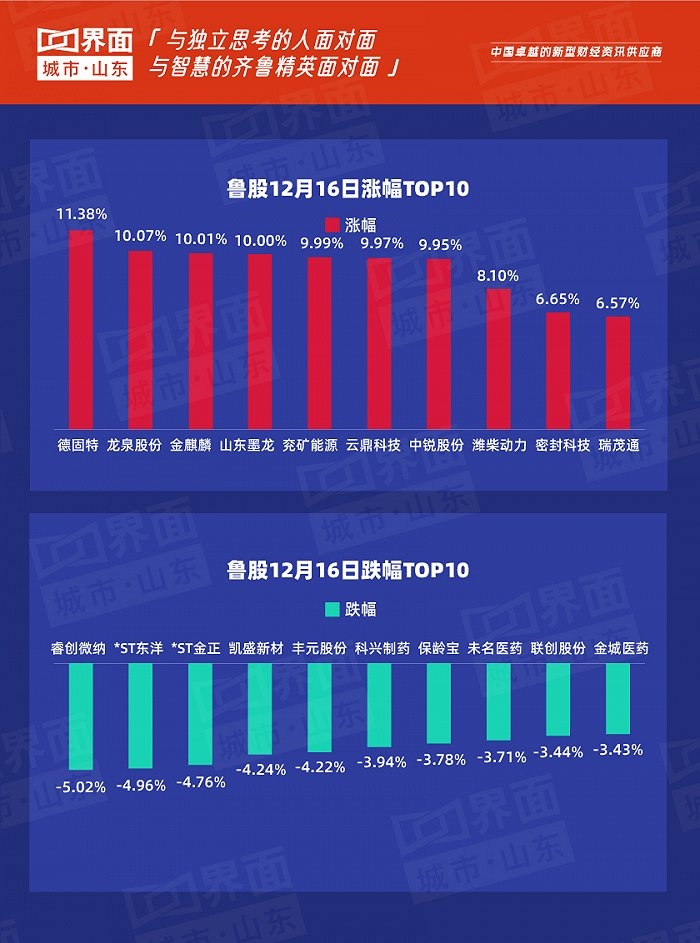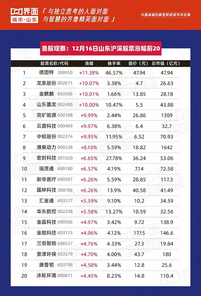 鲁股观察12月16日:德固特11.38%领涨山东,全省共170只股上涨