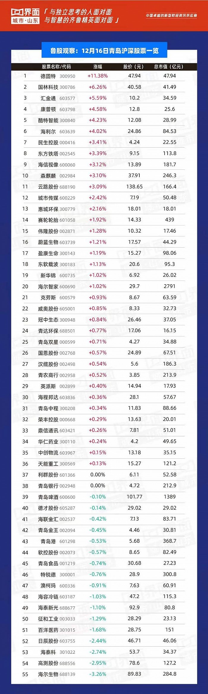 青岛市涨幅榜首:德固特(300950),涨幅11.38%,股价47.94元,总市值47.94亿元;