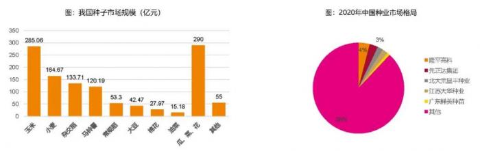 根据《2020年中国农作物种业发展报告》,2019年我国种子市场规横接近1200亿元,其中玉米、小麦杂交水稻种子是前三大品种。