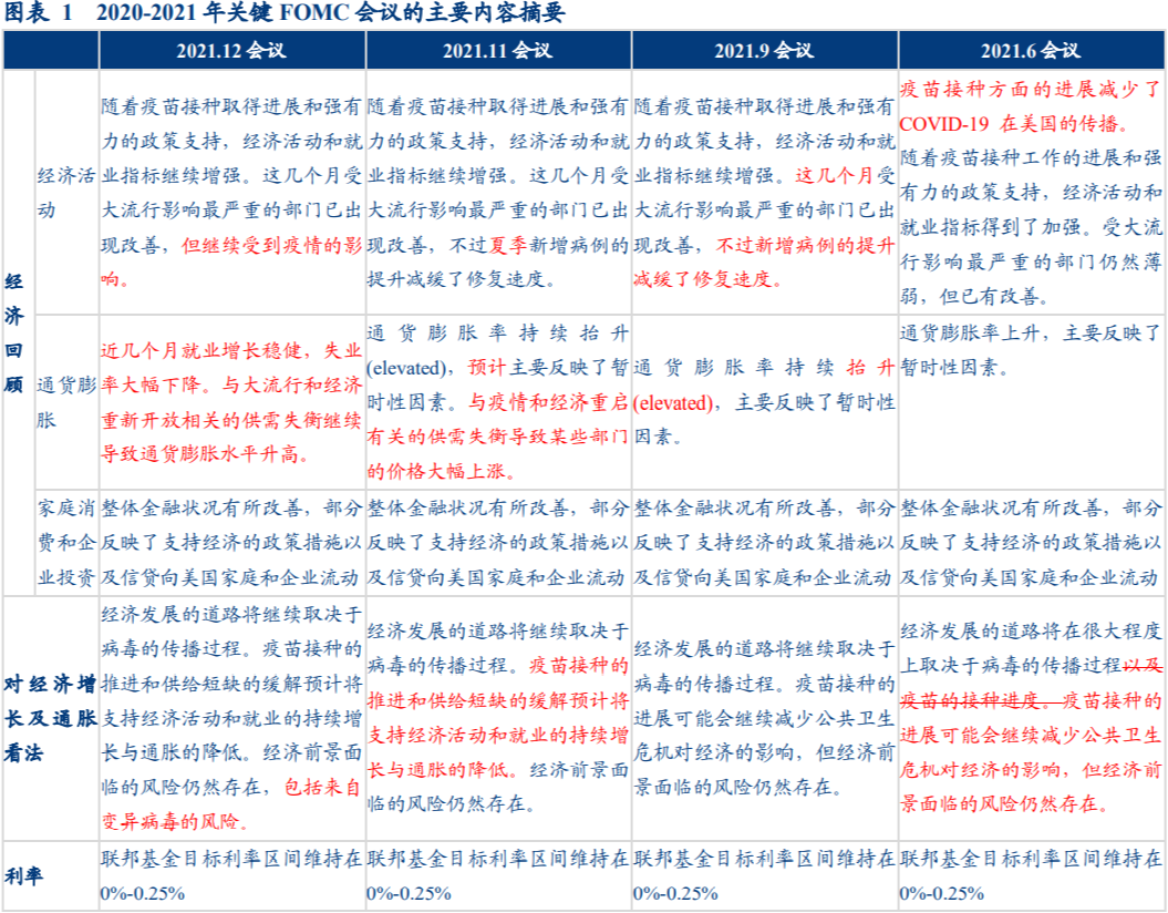 本次会议声明最大的变化在于承认通胀已达到美联储的目标水平,即声明中明确表示“通胀已经在一段时间内超过2%”。并且美联储删除了有关通胀是“暂时性”的表态,首次表示供需失衡是推动通胀持续走高的原因。同时声明中给出的利率指引为:“利率将维持在当前水平直到就业市场完成最大就业的目标”,表明在物价目标达成后,未来货币政策的观测重心将转向充分就业。