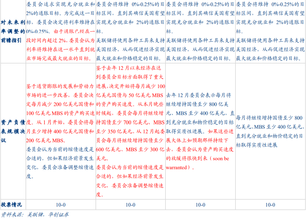 政策决议:此次议息会议如期加速Taper,计划每月减少300亿美元购债规模(国债减少200亿美元、MBS减少100亿美元),缩减速度翻倍;从2022年1月开始,每月至少购买600亿美元资产(国债至少400亿美元、MBS至少200亿美元)。按此节奏2022年一季度末将完成Taper,符合此前市场预期。