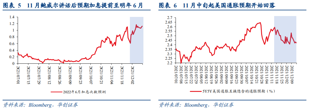 美联储营造的“大姿态”对抑制通胀预期效果显著。在本次FOMC会议前,市场对加速Taper就已有充分预期,近期资产价格的重心或已由通胀切换至经济增长,市场对通胀和加息预期走高已有相对充分的定价。一则,通胀环比增长放缓,因此11月通胀数据发布后10Y国债收益率、通胀预期反而下行。二则,鲍威尔在国会听证会中已承认通胀并非“暂时性”的,且开始讨论Taper加速,市场对2022年加息预期提前至6月, 12月FOMC会议中讨论加速Taper已形成了一致预期,因此11月CPI创新高也未引发市场对加息更强烈的预期。三则,通胀问题也引起了白宫关注。11月9日白宫情况说明书中提出了改善美国运输条件的举措,11月11日拜登发表讲话强调降低通胀是当下首要任务,一定程度上也改善了通胀预期,11月中旬起美国通胀预期开始回落。