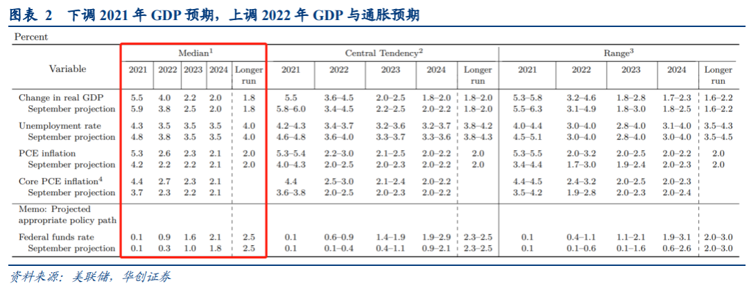 经济增长方面,美联储下调2021年GDP预期、上调2022年GDP与通胀预期。美联储在经济预测中下调了2021年GDP预测至5.5%(9月预测值5.9%),上调2022年GDP预期至4%(9月预期值3.8%);失业率方面,美联储下调了2021-2022年的失业率预测至4.3%、3.5%(9月预测值4.8%、3.8%);通胀率方面,美联储上调了2021-2023年的核心PCE预测至4.4%、2.7%、2.3%(9月预测值3.7%、2.3%、2.2%)