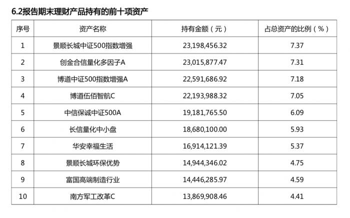 该产品是“睿赢精选组合”基金产品条线下以权益策略为主题的理财产品,通过定量和定性的方式对标的进行筛选。从三季报来看,产品穿透后投资公募基金比例高达85.44%,前十大重仓资产涵盖中证500指数增强基金、纯量化基金等。