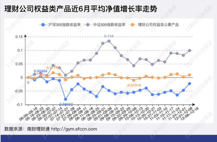 从行业整体情况来看,理财公司权益类产品近6个月平均净值增长率为0.92%,同期沪深300和中证500的阶段收益分别为-2.26%和9.91%。理财子公司权益类产品近6月收益率跑赢沪深300指数,跑输中证500指数。