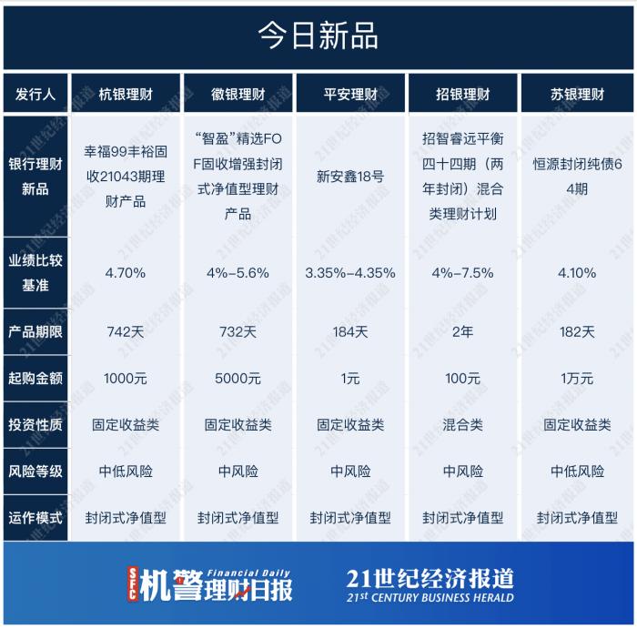 《机警理财日报》是南财理财通、21世纪经济报道旗下投资理财专栏,旨在帮投资者守好“钱袋子”。课题报道组长期关注银行理财,并搭建独有理财数据库,欢迎申请试用。本专栏每日内容各有侧重,周一聚焦固收+产品、周二纯固收产品、周三现金管理类产品、周四混合类产品、周五权益类产品,每周一至周五更新,移动端内容尽在21财经APP,平面内容尽在《21世纪经济报道》报纸【南财理财通】专栏,敬请关注!