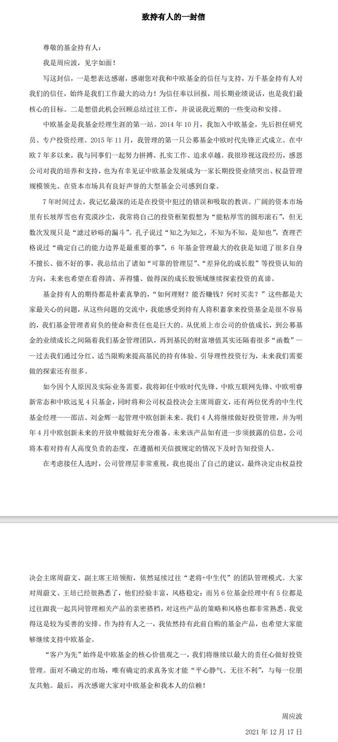 周应波在信中称,在中欧7年多以来,我与同事们一起努力拼搏、扎实工作、追求卓越。我很珍视这段经历,感恩公司对我的培养和支持,也为有幸见证中欧基金发展成为一家长期投资业绩突出、权益管理规模领先、在资本市场具有良好声誉的大型基金公司感到自豪。