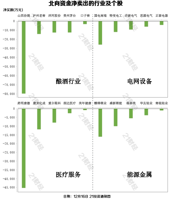 北向资金减持了28个行业,其中酿酒行业最多,净卖出金额达9.68亿元,其次是电网设备行业,净卖出5.22亿元。