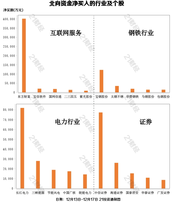 从净买入金额来看,北向资金增持了50个行业,其中互联网服务居首,净买入金额达43.08亿元,北向资金主要流入该行业个股东方财富,本周买入净额达40.15亿元。钢铁、电力板块分别获北向资金净买入27.36亿元和14.82亿元。