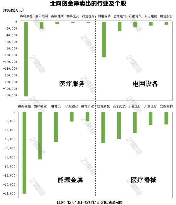 本周,北向资金大幅减持医药股。其中,药明康德(603259.SH)遭抛售22.35亿元。药明康德和片仔癀均已连续三个交易日被抛售,被卖出净额分别达21.95亿元和5.09亿元。
