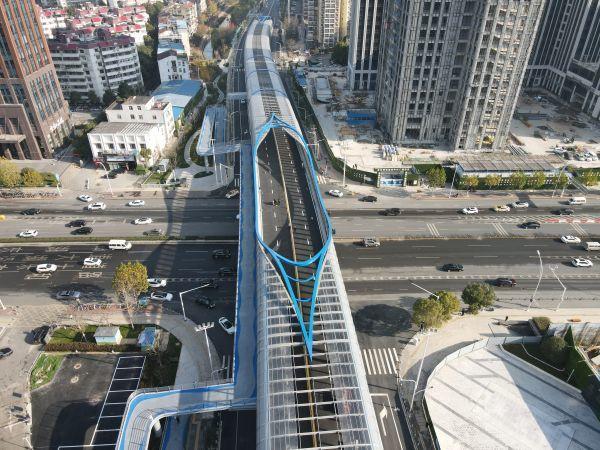 该工程由市城投集团公司所属桥建集团建设,西起秦风路,东至杨园南路,全长1.13公里,其中桥梁长475米,采用“主线跨线桥+地面辅道”方式上跨徐东大街。该工程设计车速40公里/小时,桥梁段设置双向4车道。为满足行人和非机动车过街,立交靠长江二桥一侧设有4米宽的慢行桥。