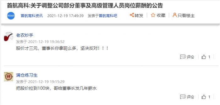 “股价才三元,董事长你拿呢么多,坚决反对!!!”一位投资者在首航高科的股吧里留下了自己的抗议,另一个投资者也抱怨道,“企业年年赔钱还有脸涨工资”。