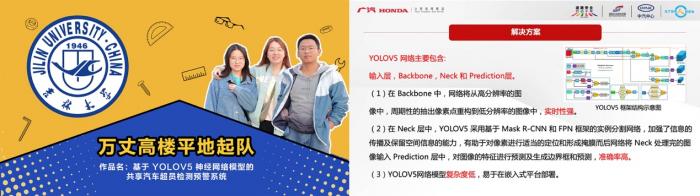 本届大赛各高校团队带来了高水准“黑科技”作品。面对共享汽车超载等安全隐患,来自吉林大学的万丈高楼平地起团队设计了“基于 YOLOV5 神经网络模型的共享汽车超员检测预警系统”,用于约束驾驶人对共享汽车的违规使用,从而保障行车安全。