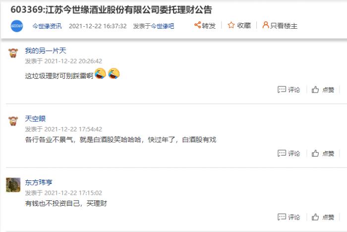 在今世缘的股吧里,股民们对此议论纷纷,有投资者担忧,“这垃圾理财可别踩雷啊”;也有投资者乐观,“各行各业不景气,就是白酒股笑哈哈哈,快过年了,白酒股有戏。”
