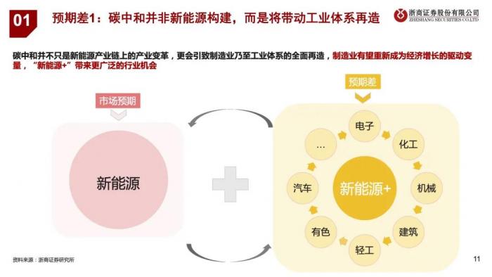目前,光伏、风电、新能源汽车等已经出现明显盈利,市场已经充分挖掘机会,但预期差不在于此,而在于产业新能源化,即每个产业都与新能源匹配,这将带来整个工业体系的再造,带来更广泛的行业投资机会,如机械、电子、化工、建筑、轻工、有色等行业。