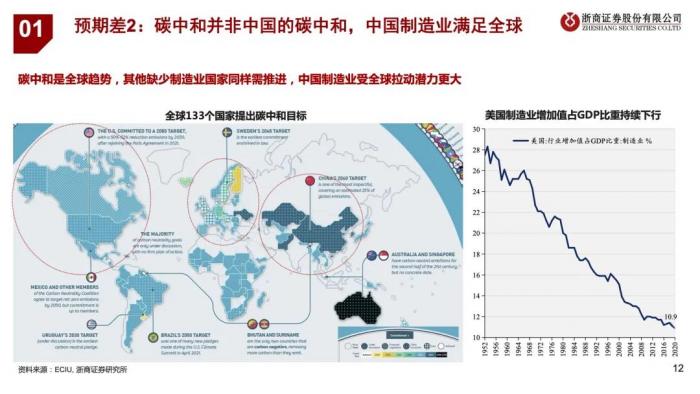 此外,当前不只是中国在推进碳中和,而是全球欧美各市场都在推进碳中和战略,但欧美市场的典型特征是制造业空心化,中国供给满足全球碳中和需求将驱动中国制造业投资持续景气。