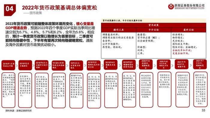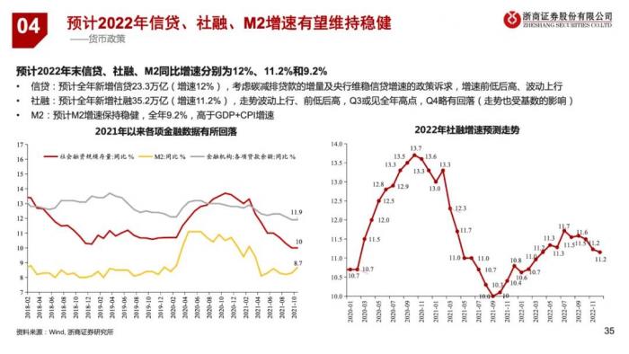 货币政策方面,2022年货币政策季调总体偏宽松,核心变量是GDP增速走势,预计一季度货币政策以稳增长为首要目标,二季度转向稳健中性,下半年有望再次转向稳健略宽松,预计2022年末信贷、社融、M2同比增速分别为12%、11.2%和9.2%。