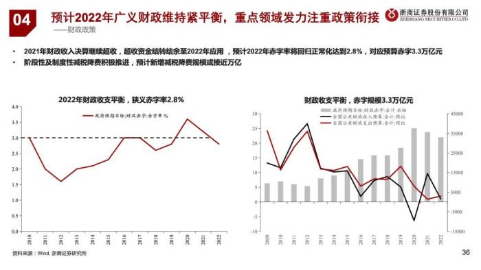 财政政策方面,预计2022年财政政策提升效能,注重精准,2021年超收资金将结转结余至2022年应用,预计2022年赤字率将回归常态化达到2.8%,对应预算赤字3.3万亿元,预计专项债规模将达到3万亿。