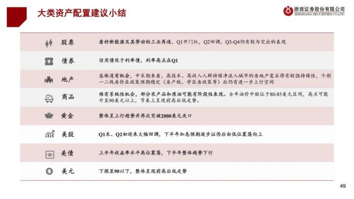 股票市场,总体上是结构性的局面,看好新能源带动的工业体系再造,节奏方面,一季度开门红,二季度回调,三四季度仍有较为突出的表现;债券市场,信用债优于利率债,10年期国债收益率高点在一季度为3.2%;此外,他对明年黄金的表现也相对乐观,或突破2000美元关口;美股方面,Q1末、Q2初迎来大幅回调,下半年加息预期逐步证伪后由低位震荡向上;美债方面,上半年收益率水平高位震荡,下半年整体趋势下行;美元方面,预计下探至90以下,整体呈现前高后低走势。