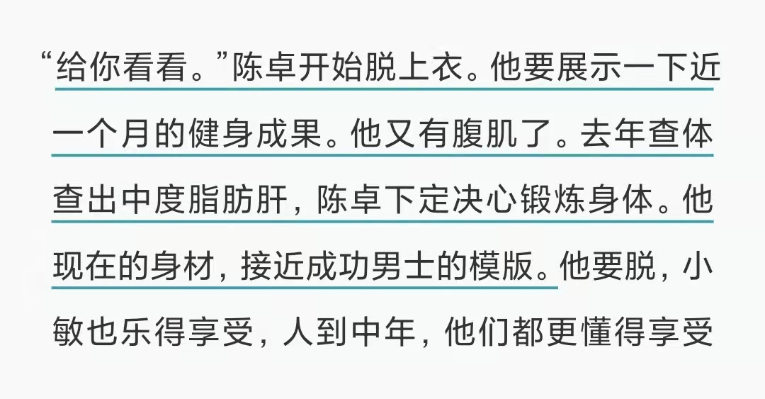 原小说中,陈卓一角虽没有取得多少世俗意义上的成功,总体还算自律,身材“接近成功男士的模板”。到了剧中,中年帅大叔变为接地气的小男人。